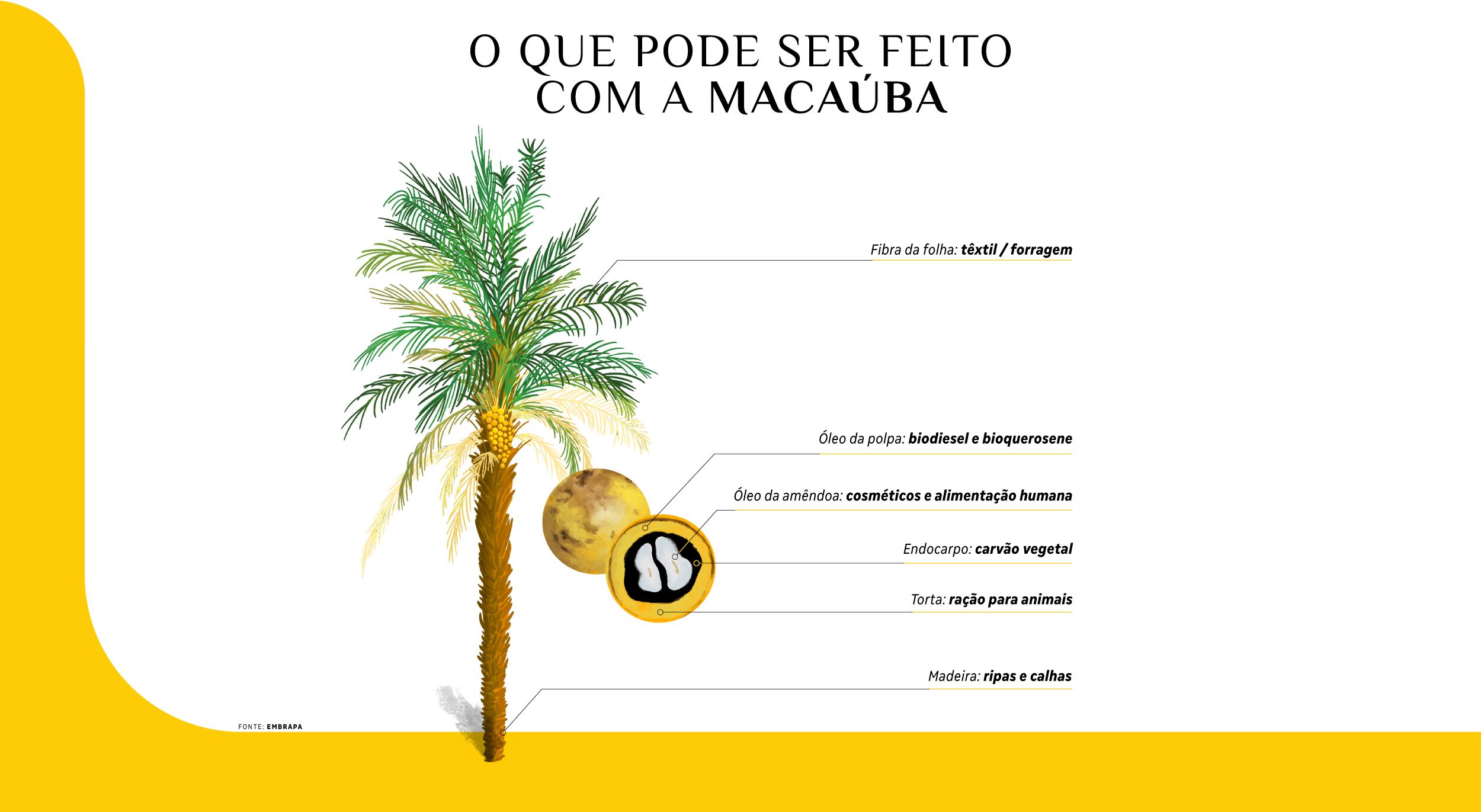 O potencial da fruta também chamou a atenção da Petrobras, referência brasileira de combustíveis. Em setembro de 2024, a estatal firmou um acordo com a Embrapa para estudar matérias-primas renováveis, como a soja e a macaúba, com foco na produção de biocombustíveis e no desenvolvimento de novos fertilizantes.