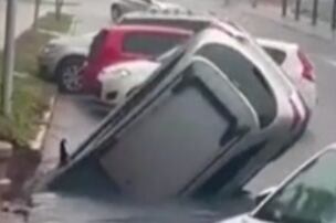 Vídeo: asfalto cede e carro afunda em buraco durante temporal em Brasília